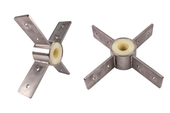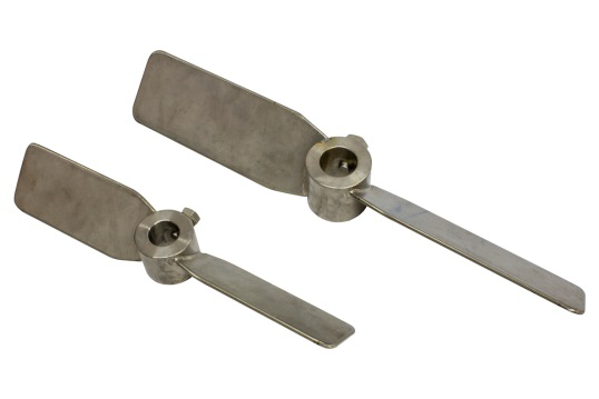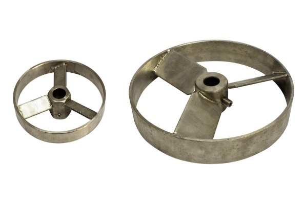 The modern design of this impeller provides excellent pumping ability with a strong axial flow. While useful in most applications, this design excels in thinner fluids that are susceptible to settling and provides the MOST pumping per unit of torque. This impeller is available as a welded or bolted assembly. The 3HEimpeller can be fabricated to fit ANY shaft diameter and comes standard in 316 Stainless Steel, but 304 Stainless Steel.